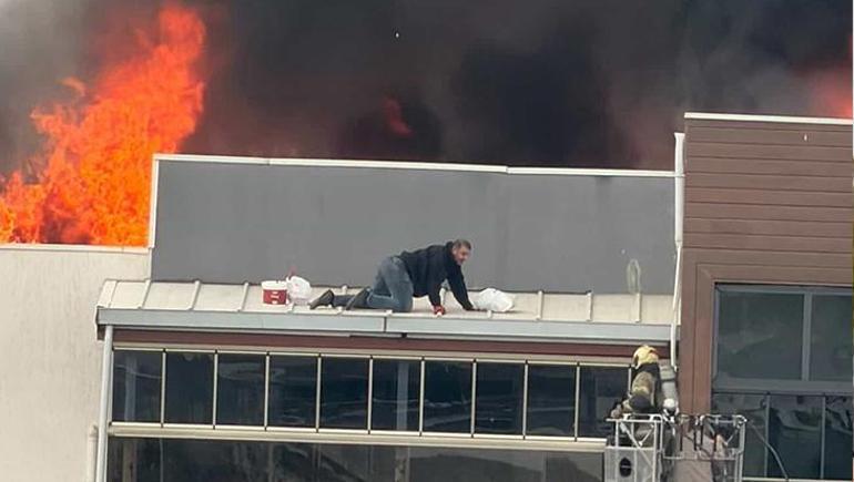 Yangın sırasında kendini son anda dışarı atan bir işçi, çatının ucunda yardım beklerken, ekipler zamana karşı yarıştı. O anlar kameraya yansırken, yaşananlar faciaya ramak kaldığını gözler önüne serdi.